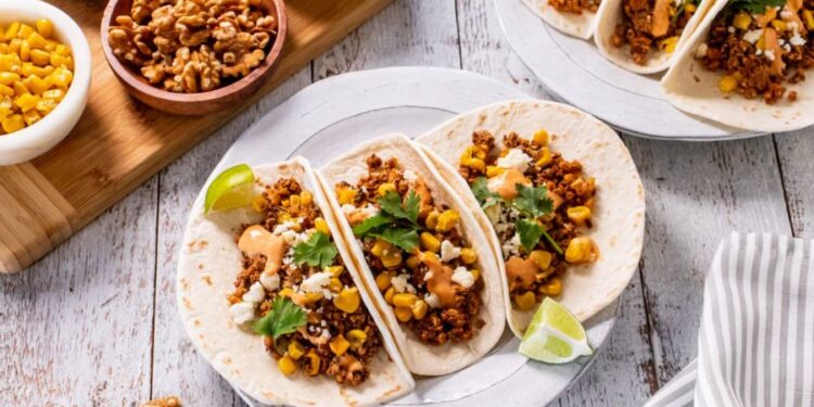 Expect a touch of smoky flavor in these vegetarian tacos, courtesy of the fire roasted corn and chipotle adobo sauce. That boldness in flavor is contrasted with creamy cotija cheese and sour cream, and brightness from fresh lime and cilantro. The “meat” is made with a hearty combination of walnuts and chopped mushrooms. For a twist on the recipe, serve the taco filling over a rice base instead of in tortillas.