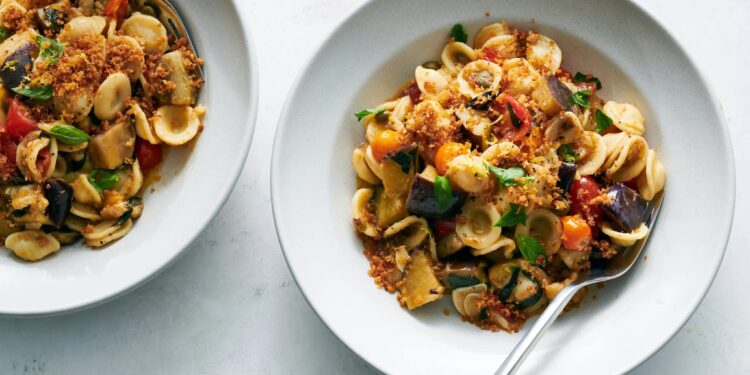 I had a better — or, at least, more momlike — idea. Instead of ditching the pasta, I’d add half of what I usually used and scatter double the amount of crispy bread crumbs on top. I’d need a sauce to keep the bread crumbs from sliding off the pasta: Some sautéed eggplant and tomatoes would simultaneously glue things down and round the dish out. And a handful of capers would add just the right tang.