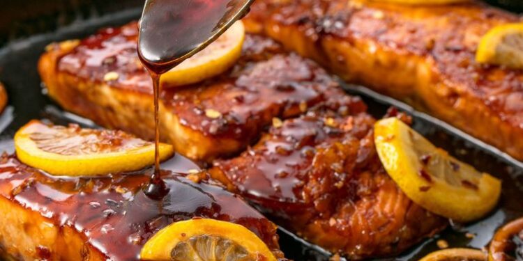 - Add garlic to the skillet and cook until fragrant, 1 minute. Add the honey mixture and sliced lemons and cook until sauce is reduced by about 1/3. Baste salmon with the sauce.