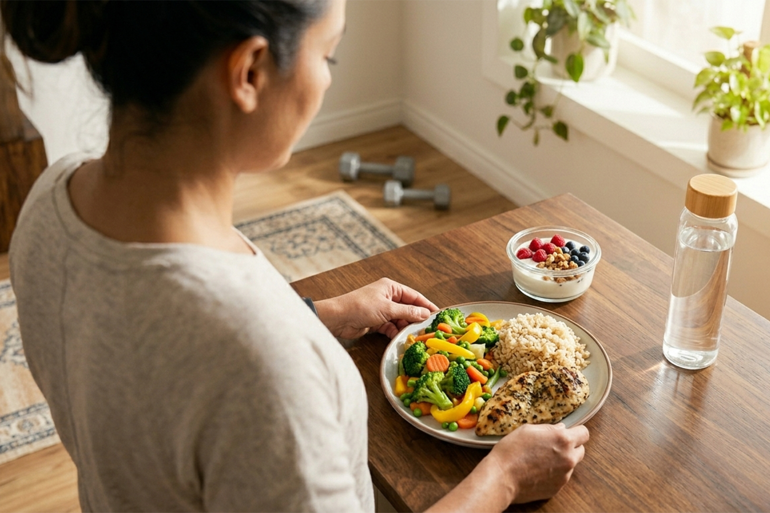 Focus on balanced plates, adequate protein, and practical timing rather than perfection.